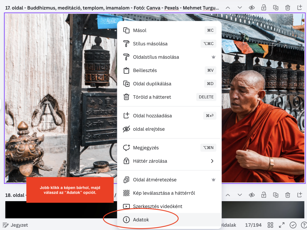 A Canva-ban a kép forrását könnyedén megtalálhatod. Ehhez csak jobb egérgombot kell megnyomnod, kiválasztani az „Adatok” opciót és máris megjelennek a kép metaadatai, melyeket meg kell adnod a szerkesztőségi felületén.