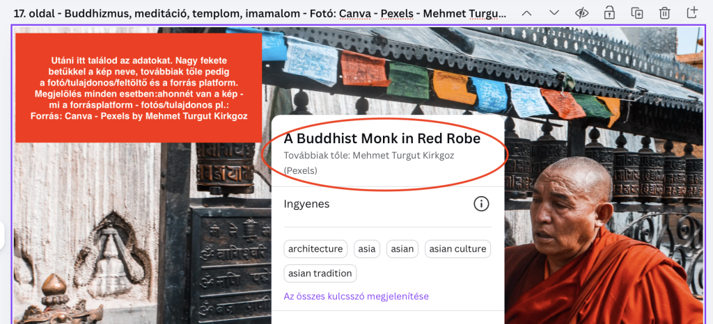 Már a Canva felületén érdemes megadni a főbb adatokat: mi van a képen? mi a forrás és minden egyéb. Például: Ha a kép buddhista szerzeteseket ábrázol egy tibeti templom előtt, ahol imazászlók vannak kihelyezve akkor a kép címe: imamalom, szerzetes, imazászló, buddhista, templom | Forrás: Canva – Pexels by Mehmet Turgut Kirkgoz – és a végén beírni a forrást.
